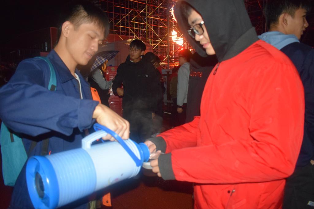 当晚微雨蒙蒙,公司团委书记韦喆带领着公司员工顶着寒冷的夜晚,在南校田径场舞台后场搭设站点,为公司表演者提供姜汤来驱寒取暖。天气虽然寒冷,但现场却是如此的温暖,一杯温暖的姜汤,温暖着公司表演者的心。一幅幅温暖人心的画面依旧历历在目,一句句简单的问候,就是对他们最大的鼓励和支持。
