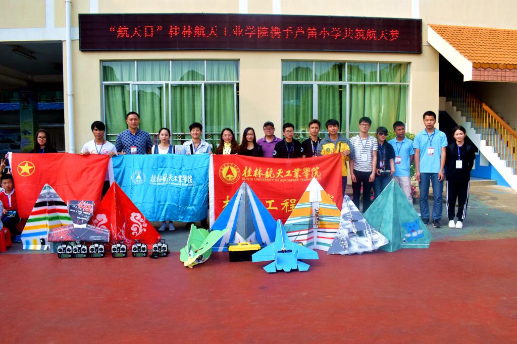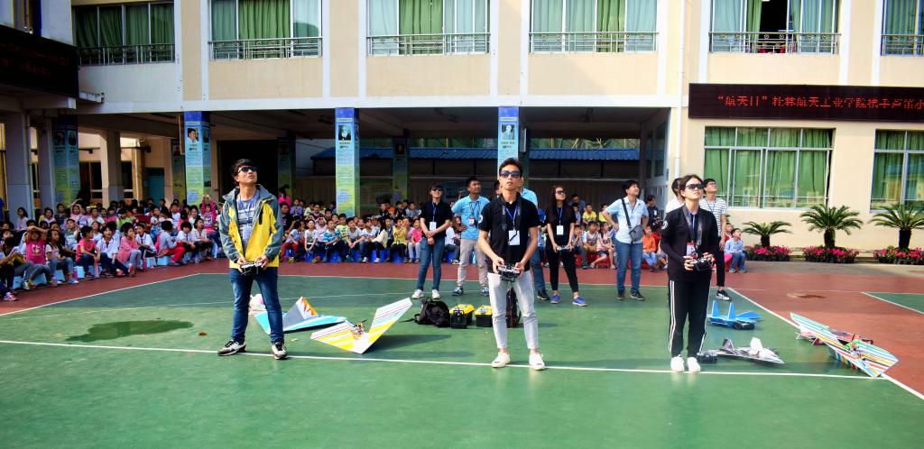 为迎接中国航天日的到来,响应校团委的号召,机械工程公司微小飞行器实验室航模表演队于20日下午到桂林市芦笛小学开展飞行表演活动,校团委综合科科长李中焘老师、院团委书记韦喆老师以及小朋友们观看了此次表演。