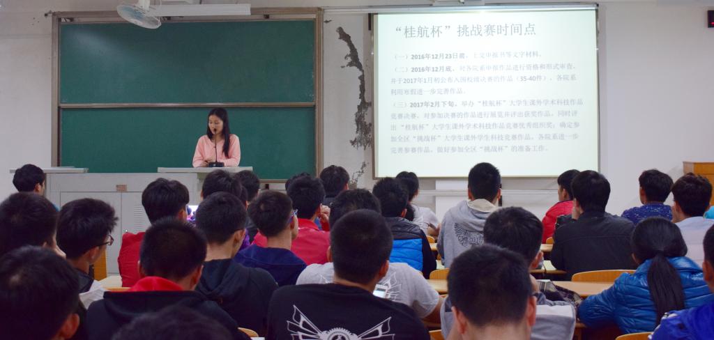 会议上,首先由丁结平老师介绍“挑战杯”的由来,并给出了“挑战杯”的参赛作品方式,除此之外还介绍了公司第一届“桂航杯”挑战赛的时间点和举例了各式各样的科技比赛。接着,夏腾辉同学他以自身经历分享了自己近些年参加各类科技实践比赛的历程。活动最后,院团委书记韦喆老师说:“希望我们能够一直保持热情,不要有后顾之忧,要将理论放在实践之中,有想法就要敢于动手,不要小看自己的能力,要从一次次的小小比赛积累经验,让我们有热情也要想法,有好的点子要记得找老师,公司会保证基本条件让我们能够将实践进行到底。”老师的讲话迎来了阵阵掌声,20点30分,宣讲活动在热烈的掌声中圆满结束。