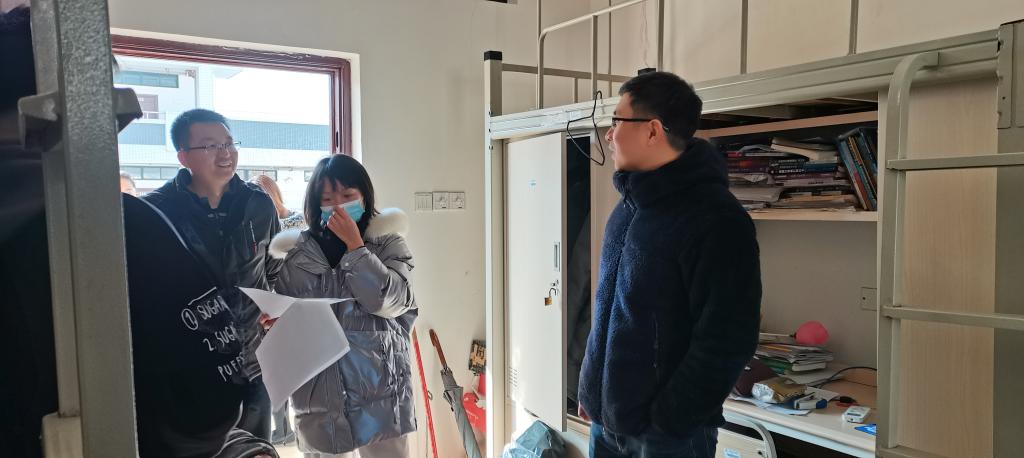 10:30,唐书记带领公司全体辅导员走入员工宿舍,共走访了天和苑1号楼、7号楼和8号楼。走访过程中,唐书记对同学们的宿舍卫生环境进行了细致地检查,并亲切地与员工交谈,了解他们近期的学习、生活情况,督促员工养成良好的作息习惯,营造良好的宿舍氛围。鼓励同学之间应团结友爱,相互督促,共同进步。唐书记还细心叮嘱同学们要注意用电安全、财产安全和出行安全,并特别强调目前全国疫情依旧严峻,督促员工要做好个人安全防护,在寒假返乡途中要佩戴口罩,尽量减少与其他人员交流,避免聚集,与同乘者尽量保持距离;寒假期间要少外出、少聚集,不前往中高风险地区。