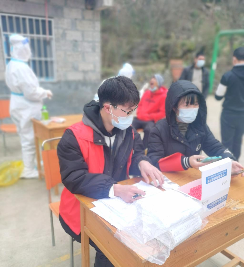 图为:冉胤智和冉美丽协助医护人员做核酸检测登记现场