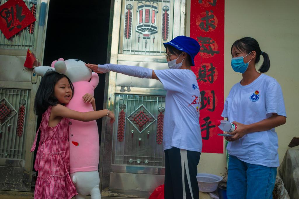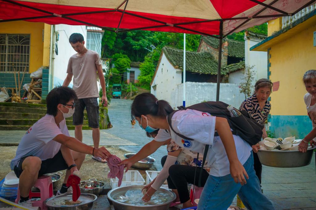 图为实践成员帮助村民刷碗