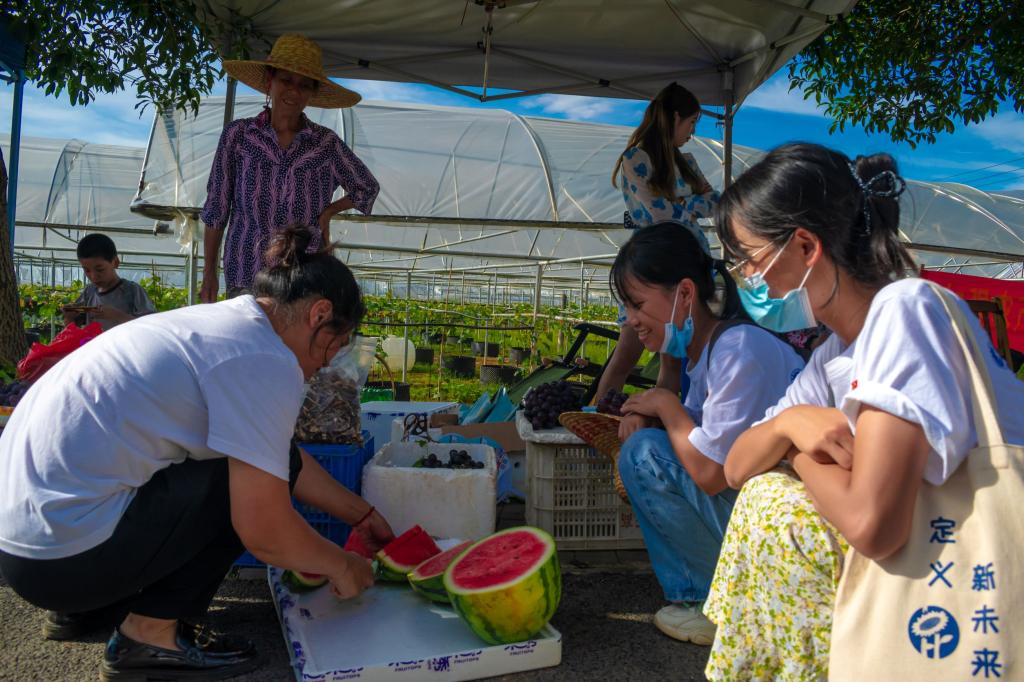 图为许玉玲请实践成员吃西瓜