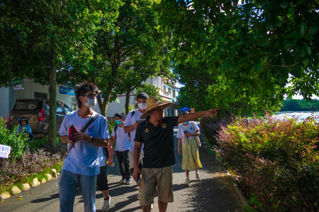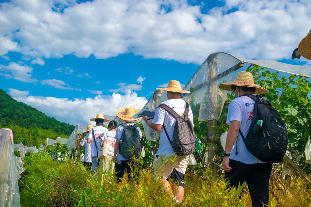 图为毛竹山村民讲解员带领实践成员参观葡萄基地
