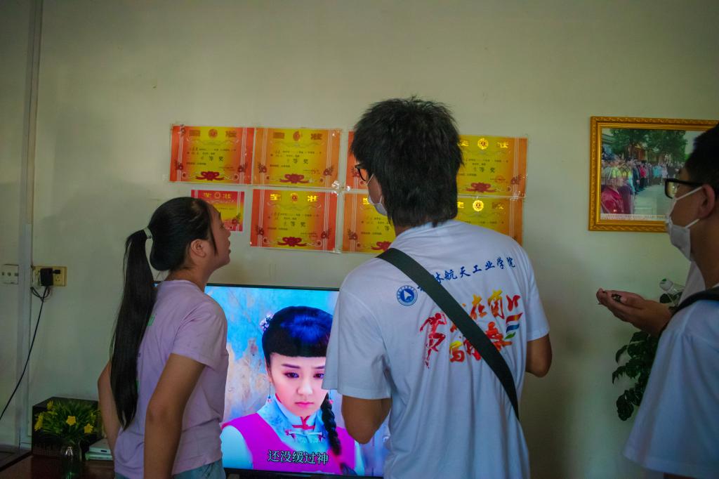 图为王嘉晨带实践成员看她获得的奖状