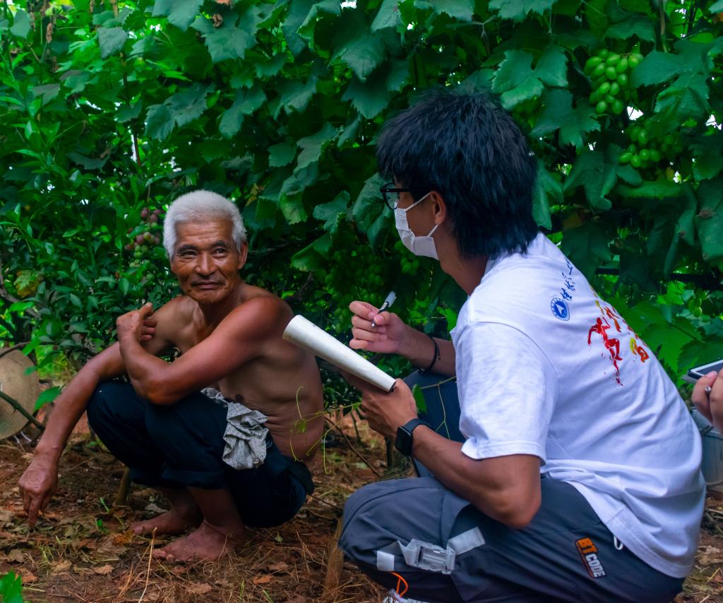 图为实践成员在葡萄地与王世龙聊天