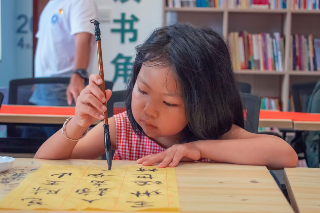图为小朋友正聚精会神地书写作品