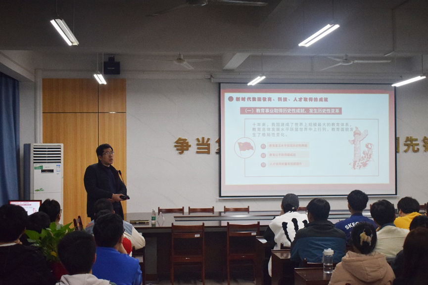 为引导公司全体师生全面学习党的二十大精神,深刻领悟党的二十大精神的核心要义,营造学习贯彻党的二十大精神的浓厚氛围。3月29日下午,公司于巡天楼229会议室召开“机电思政大讲堂”第二讲。本次大讲堂由公司副经理(主持行政工作)韩兴国主讲,2020级、2021级与2022级各班班委成员参加讲座。讲座由公司办公室主任陈秋静主持。