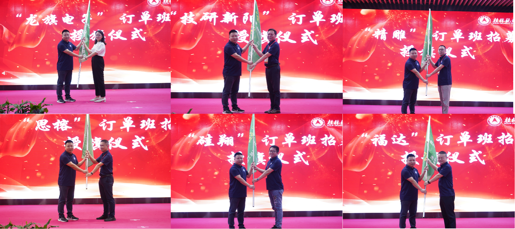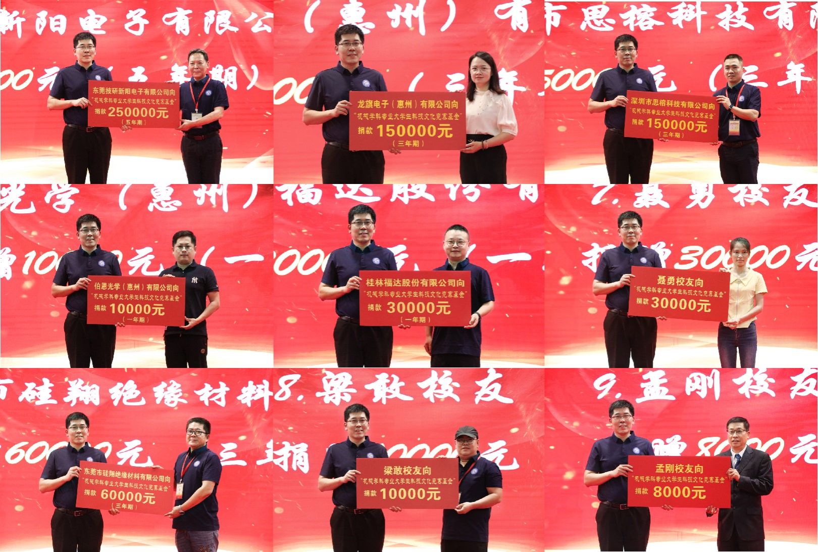 开幕式上,东莞技研新阳、深圳思榕科技、龙旗惠州公司、深圳伯恩光学、东莞硅翔新材料、桂林福达股份及2003届员工孟刚、2003届员工张祥生、2005届员工聂勇、2009届员工梁敢纷纷向“机械学科专业老员工科技文化竞赛基金”捐款,共计捐款七十万元(¥700000),并为6个2025届机械工程师企业订单班授班旗,正式启动订单班招募工作。