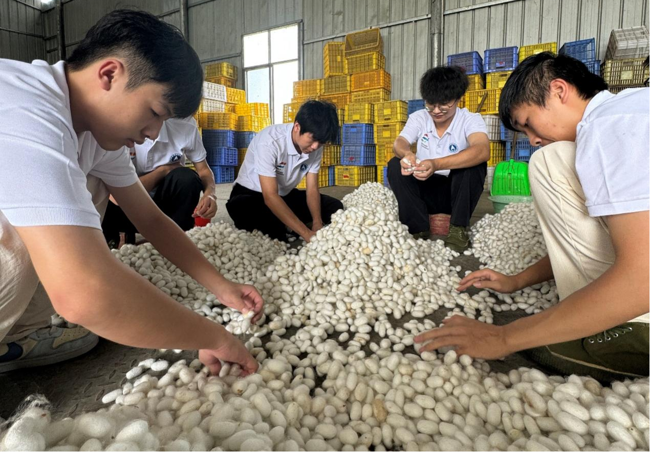 早上,实践团成员来到收茧站。在工厂人员的指导下,实践队成员学会了辨别优质茧,应该具有洁白的颜色和匀整的形状。随后实践队成员帮助工厂人员挑选出优质茧。