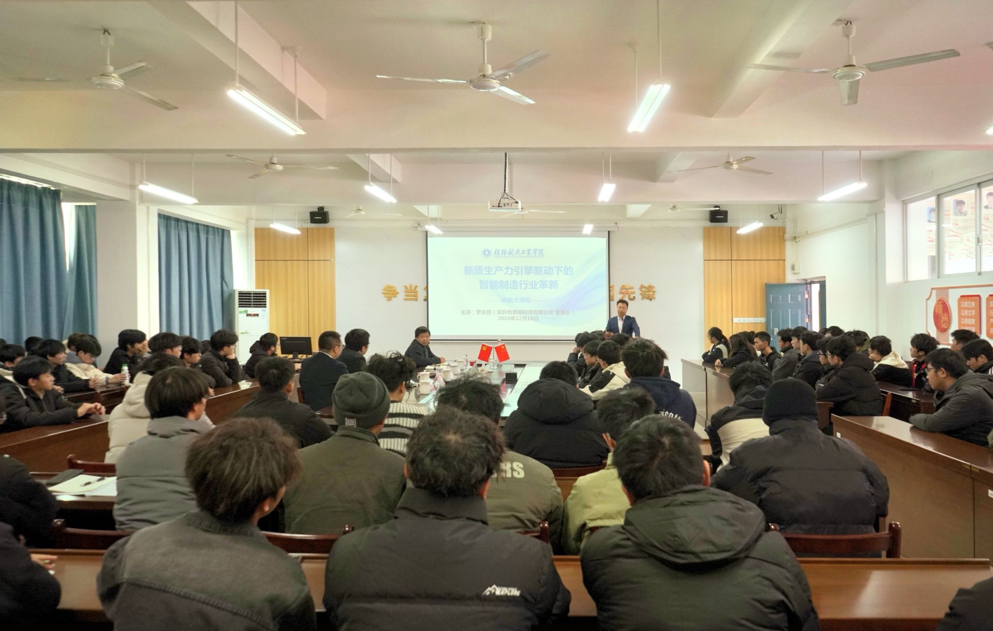 罗永民董事长表示,企业将继续与公司不断深化产教融合与协同育人工作,全力办好企业订单班、助力科技文化竞赛,共同承担新时代高等教育新使命。随后,罗永民以“新质生产力引擎驱动下的智能制造行业革新”为题,结合当前就业市场与行业发展趋势,针对师生关注的人工智能、新能源等新兴领域发展和员工的职业规划作了精彩报告。